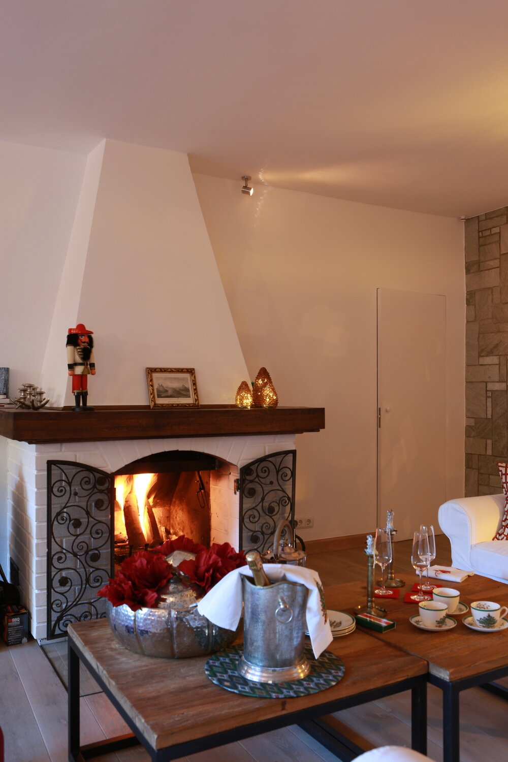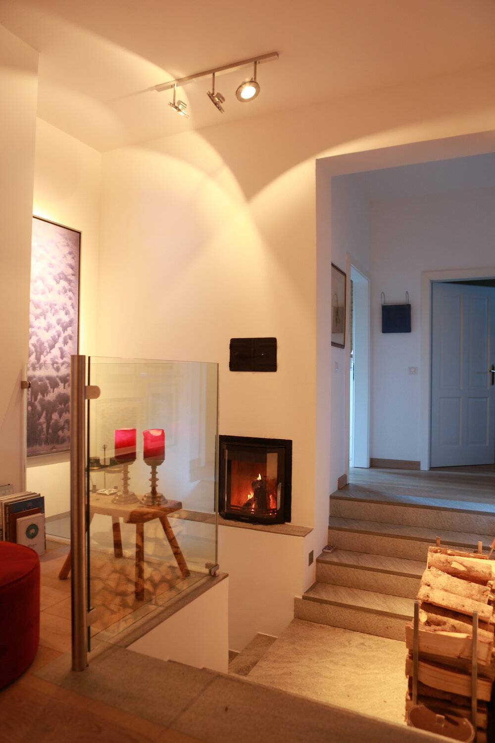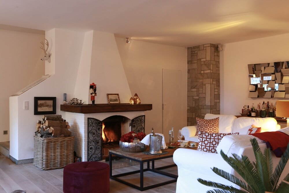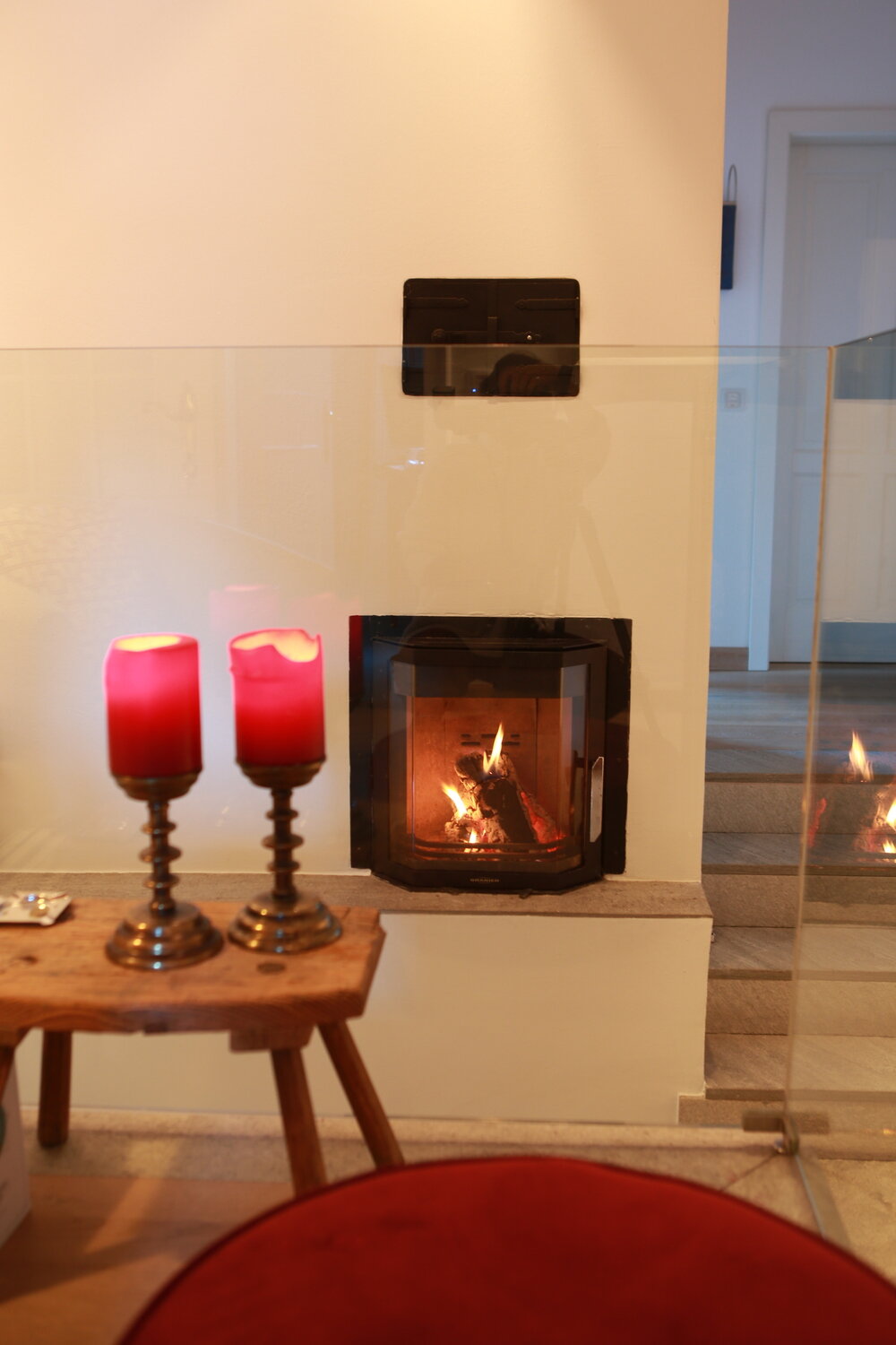Die „Zirbenstube“ hat ihren Namen zu Recht, da sie komplett aus dem edlen Holz gearbeitet ist. Vanessa und Roland haben die Zirben Decke und -Wand belassen und sie aufwendig verpackt, um sie beim Umbau zu schützen. Auch der wunderschöne, offene Kamin im Wohnzimmer war bereits im Haus eingebaut.