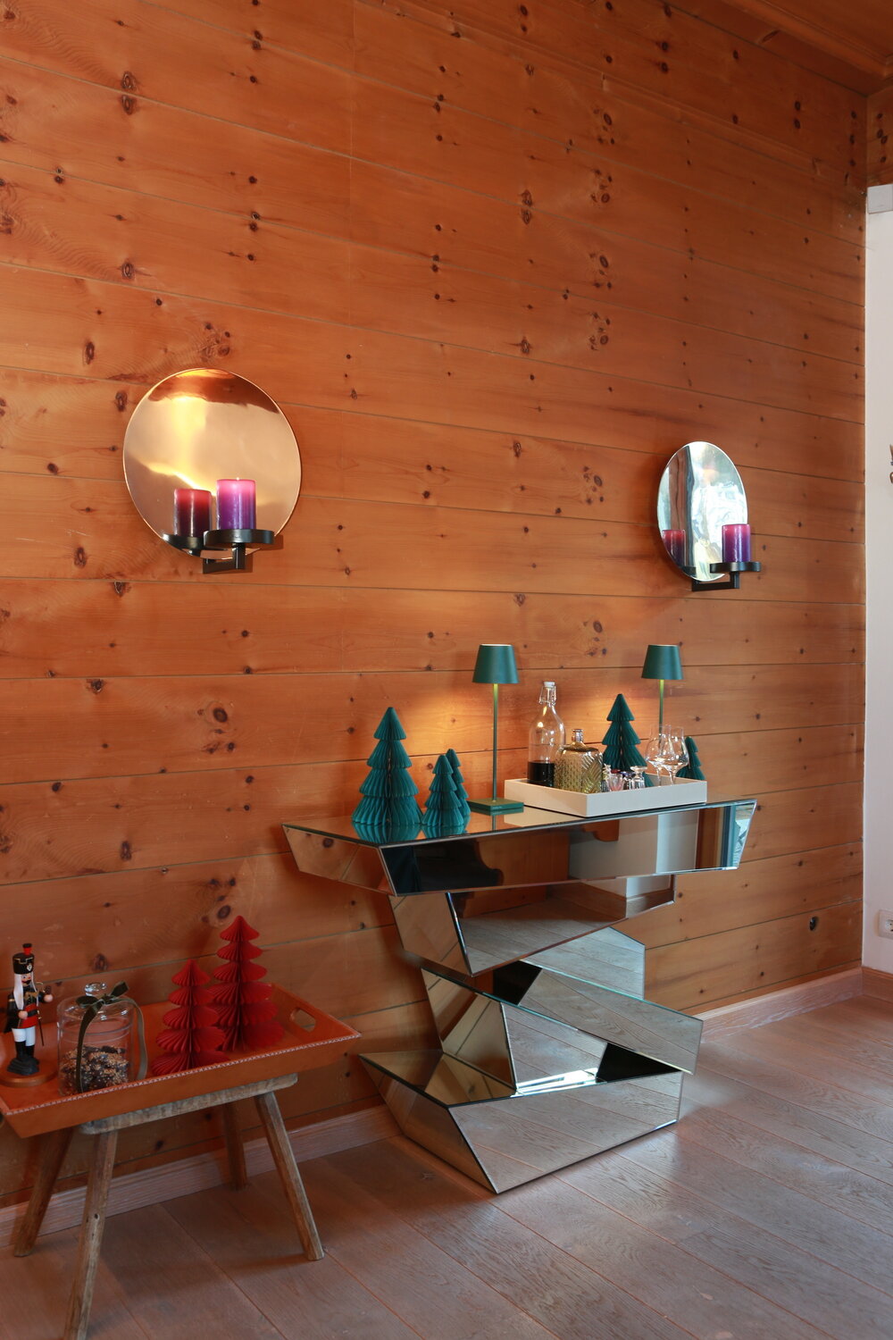 Als Pendant zum Spiegel im Wohnzimmer hat Vanessa einen Spiegeltisch an die Wand gestellt; in Anlehnung an die Berge, wie sie sagt und auch, um einen Bruch zu dem Holz im Inneren des Hauses herzustellen.