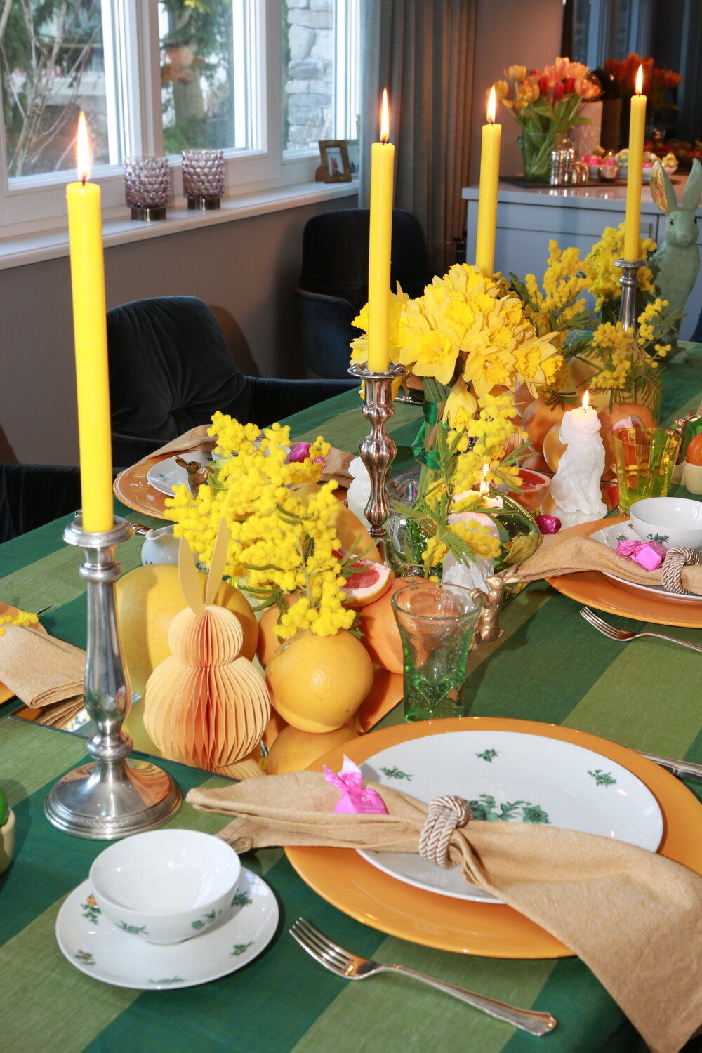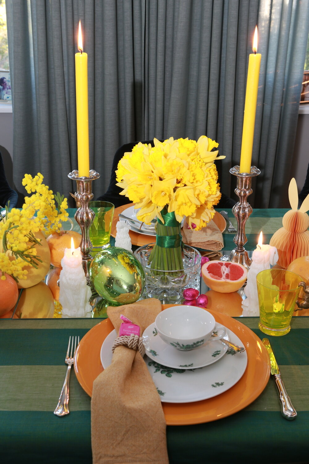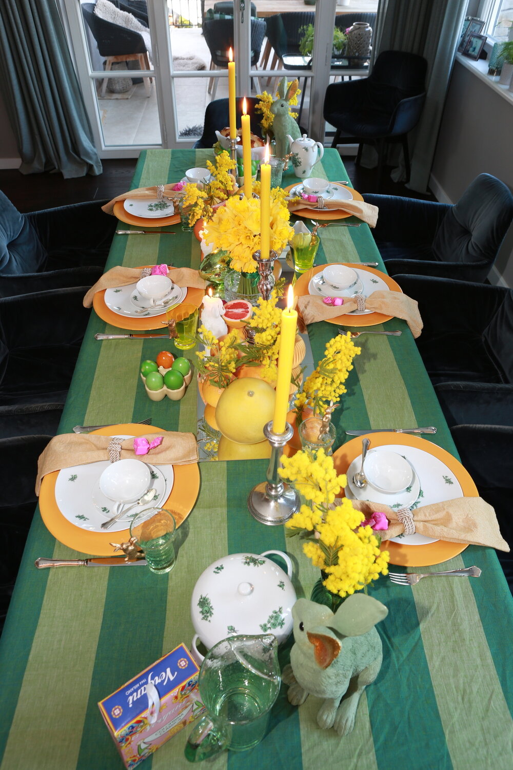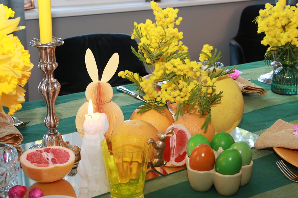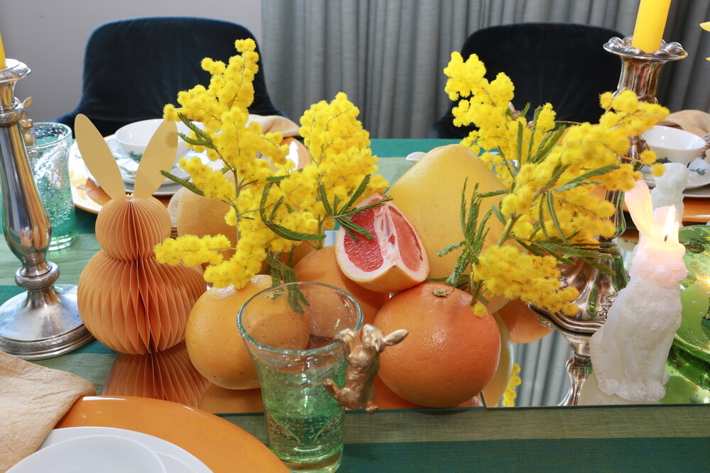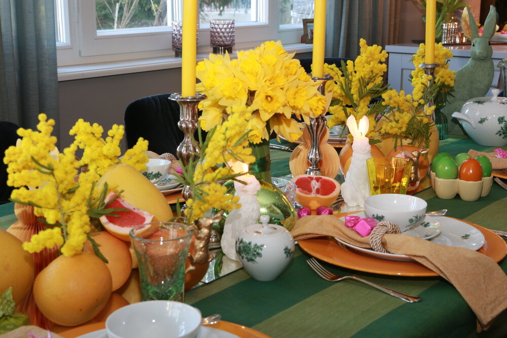 Wir lieben Stripes! Deshalb haben wir unseren Tisch mit einem grün gestreiften Leinen-Tischtuch gedeckt, das die frühlingshafte Grundlage bildet und an junge Wiesen erinnern soll. Darauf leuchten gelbe Mimosen und Narzissen wie kleine Sonnenboten. Orangefarbene Grapefruits und die größeren Pomelos komplettieren das farbige Bild. Die Mimosen, die als „Sinnpflanzen“ gelten, haben wir in die Grapefruits hineingesteckt. Das sollte vorsichtig geschehen, weil die Pflanze bei Berührung oder Erschütterung sofort ihre gefiederten Blätter zusammenklappt. Wenn die Mimosen blühen, tun sie das mit rosa-violetten Blüten; eine Farbe, die als Eyecatcher für unseren Ostertisch passend ist: Wir haben pinke Tartufo Dolce dekoriert.